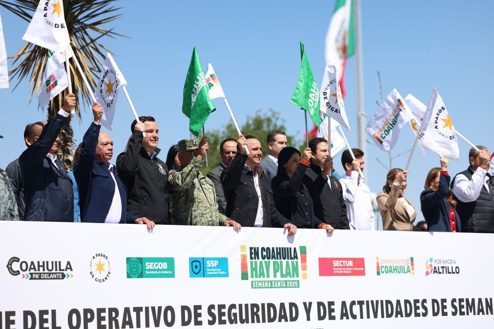 Saltillo, Coahuila de Zaragoza; a 7 de abril de 2025.- El gobernador Manolo Jiménez Salinas, acompañado por el general Alberto Ibarra Flores, Comandante de la XI Región Militar, así como por autoridades de instancias federales, estatales, alcaldes y alcaldesas, pusieron en marcha el Operativo de Seguridad Semana Santa 2025, en el cual dependencias de los tres órdenes de gobierno están en coordinación estrecha para brindar a los visitantes seguridad, orientación e información, y que vivan una gran experiencia en nuestra entidad.