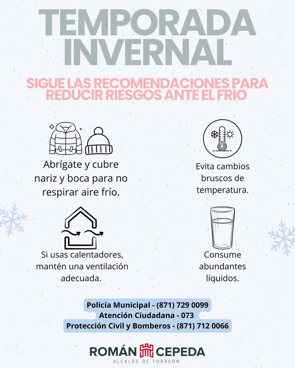 Ante la temporada de bajas temperaturas, el alcalde de Torreón, Román Alberto Cepeda, dio a conocer una serie de recomendaciones preventivas para proteger a la población, especialmente a los sectores más vulnerables.