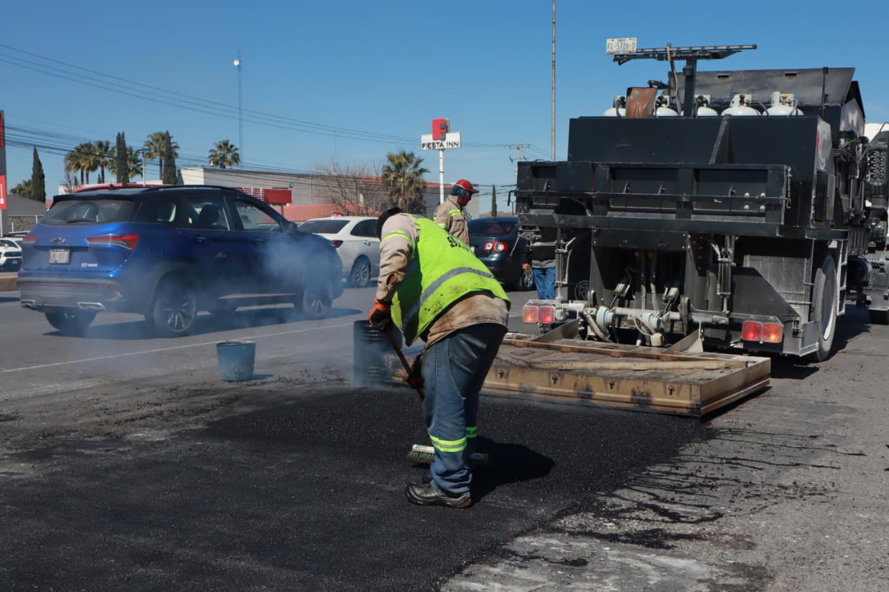 En este sector, cuadrillas de la Dirección de Infraestructura y Obra Pública trabajan con maquinaria especializada para eliminar hundimientos y grietas que pudieran representar un riesgo para automovilistas, transporte público, ciclistas y peatones.