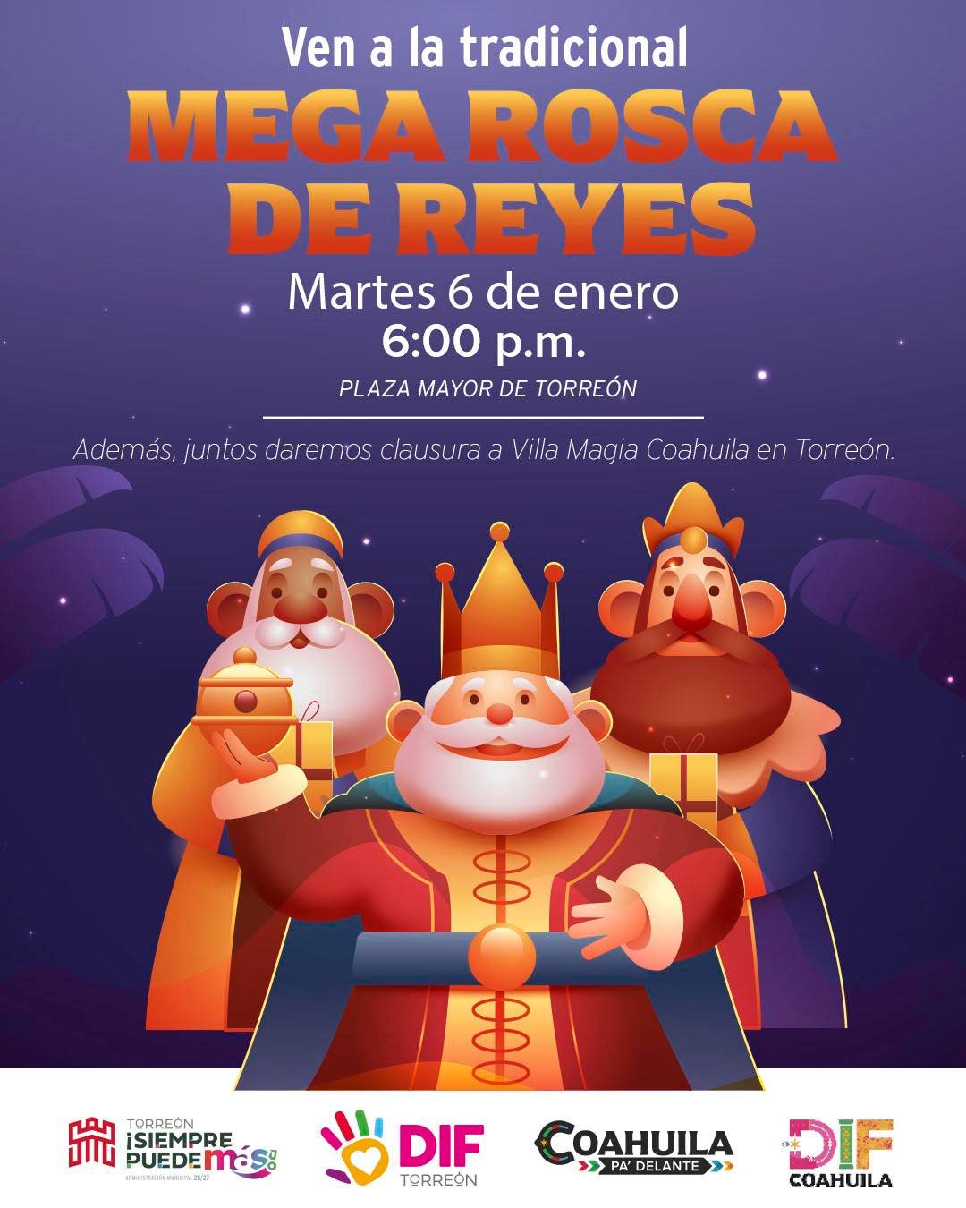 La celebración se llevará a cabo este martes 6 de enero a las 6:00 de la tarde en la Plaza Mayor de Torreón, donde además se realizará la clausura de Villa Magia Coahuila. El Gobierno Municipal invitó a las familias a sumarse a esta actividad pensada para el disfrute de todas y todos.
