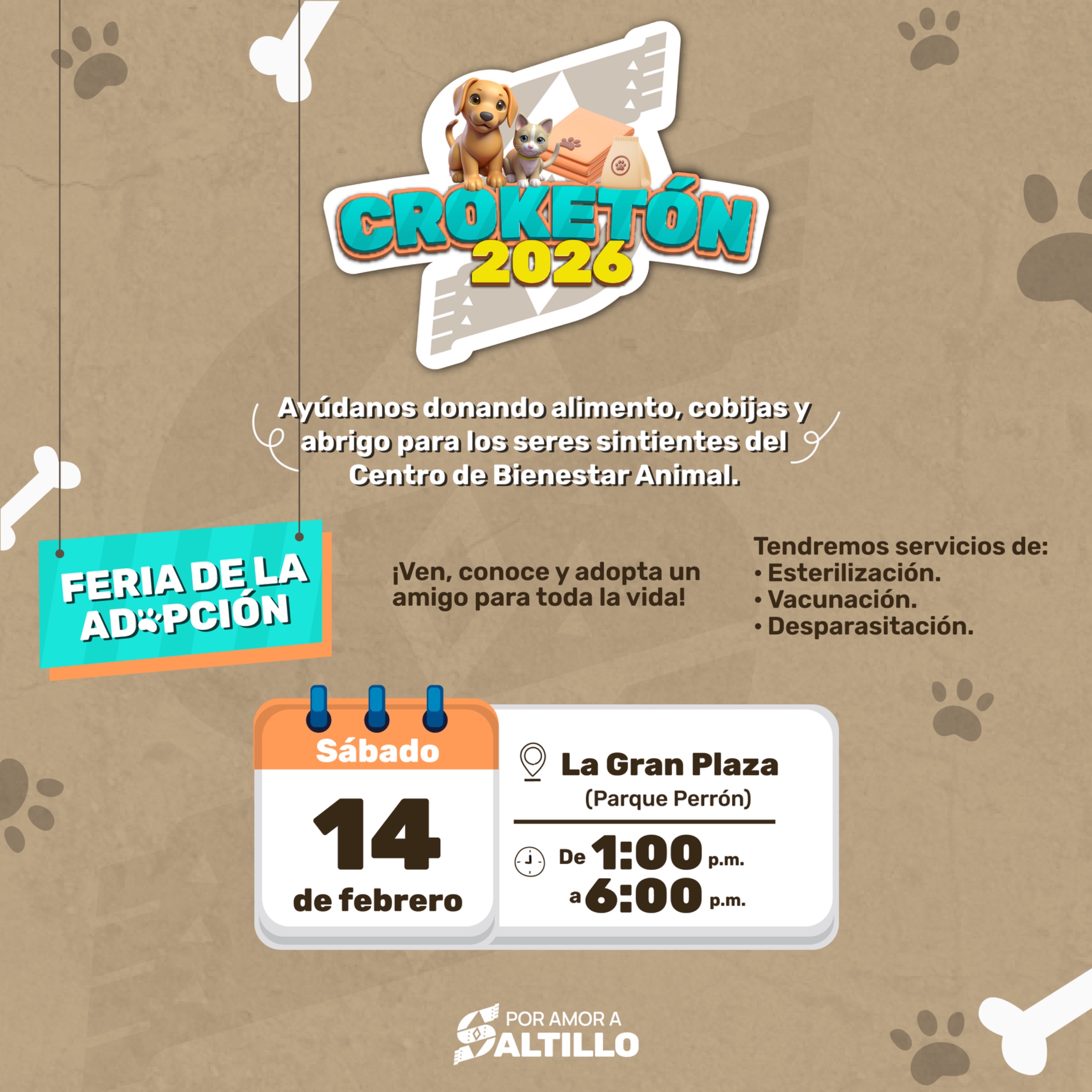 Saltillo, Coahuila de Zaragoza; 10 de febrero de 2026.- El Gobierno Municipal de Saltillo invitó a la ciudadanía a sumarse este sábado 14 de febrero al Croquetón 2026 y apoyar donando alimento, cobijas o abrigo para los seres sintientes que más lo necesitan.