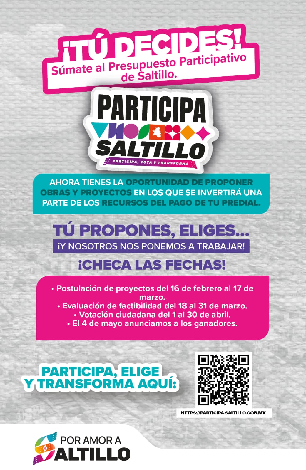 Saltillo, Coahuila de Zaragoza; 19 de febrero de 2026.- El alcalde Javier Díaz González informó que se encuentra abierto el proceso de postulación de proyectos de Participa Saltillo 2026, en el que las y los ciudadanos tienen la posibilidad de elegir obras o acciones que deseen implementar en el sector en el que viven.