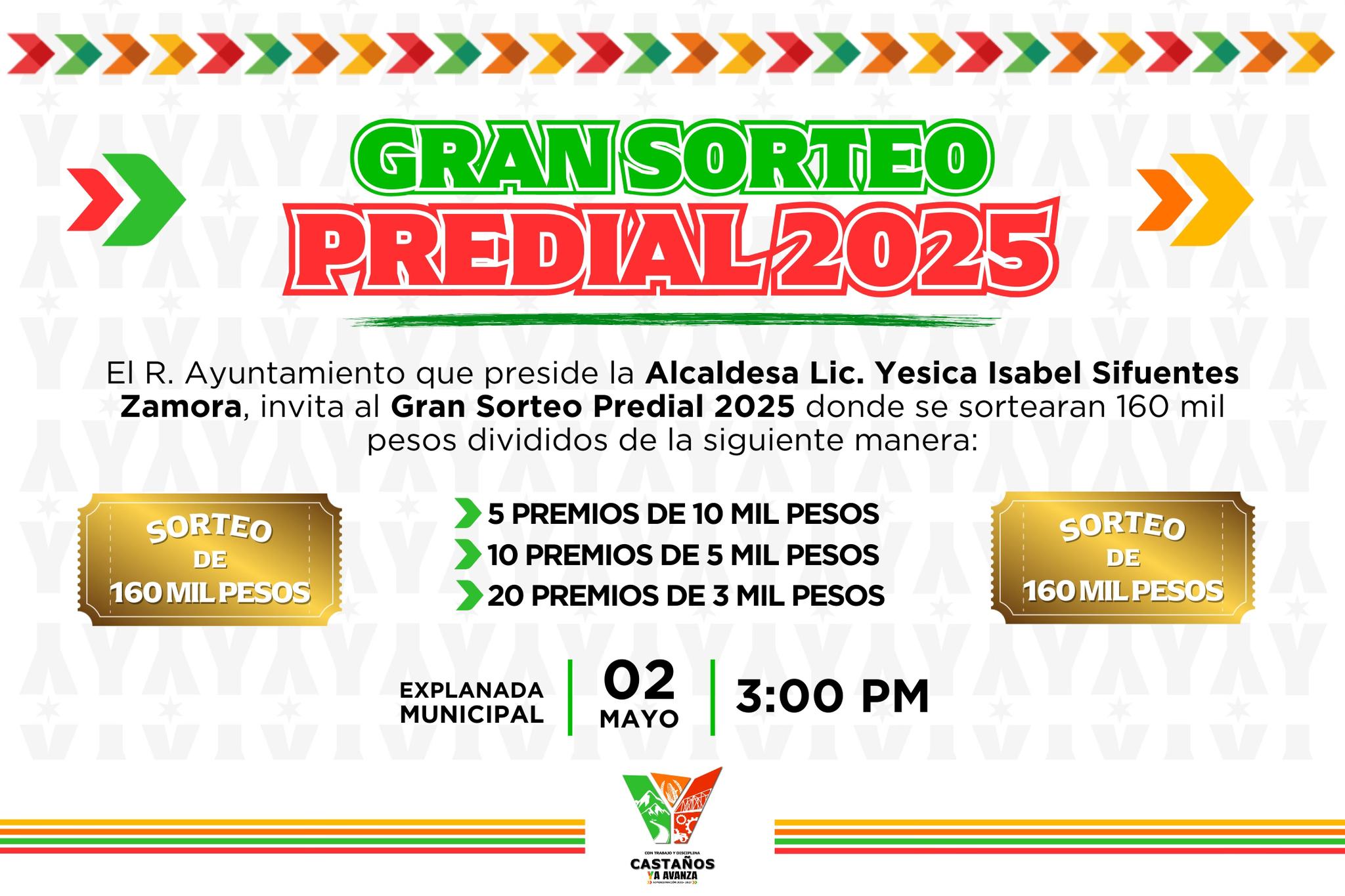Este viernes, a partir de las 3:00 p.m., se llevará a cabo el Gran Sorteo Predial 2025 en la Explanada Municipal de Castaños, donde se repartirán premios por un monto total de $160,000 pesos.