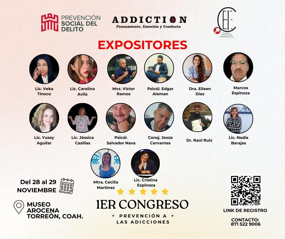 El Municipio de Torreón invita al primer Congreso de Prevención de Adicciones, que se desarrollará el 28 y 29 de noviembre de 2024, en las instalaciones del Museo Arocena.