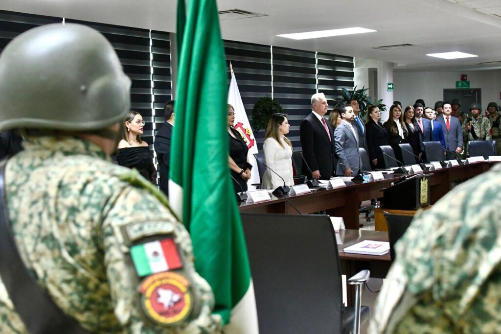 Al inicio de la Sesión Solemne, se realizaron los Honores a la Bandera, a cargo de la Escolta y Banda de Guerra de la XI Región Militar y la entonación del Himno Nacional.