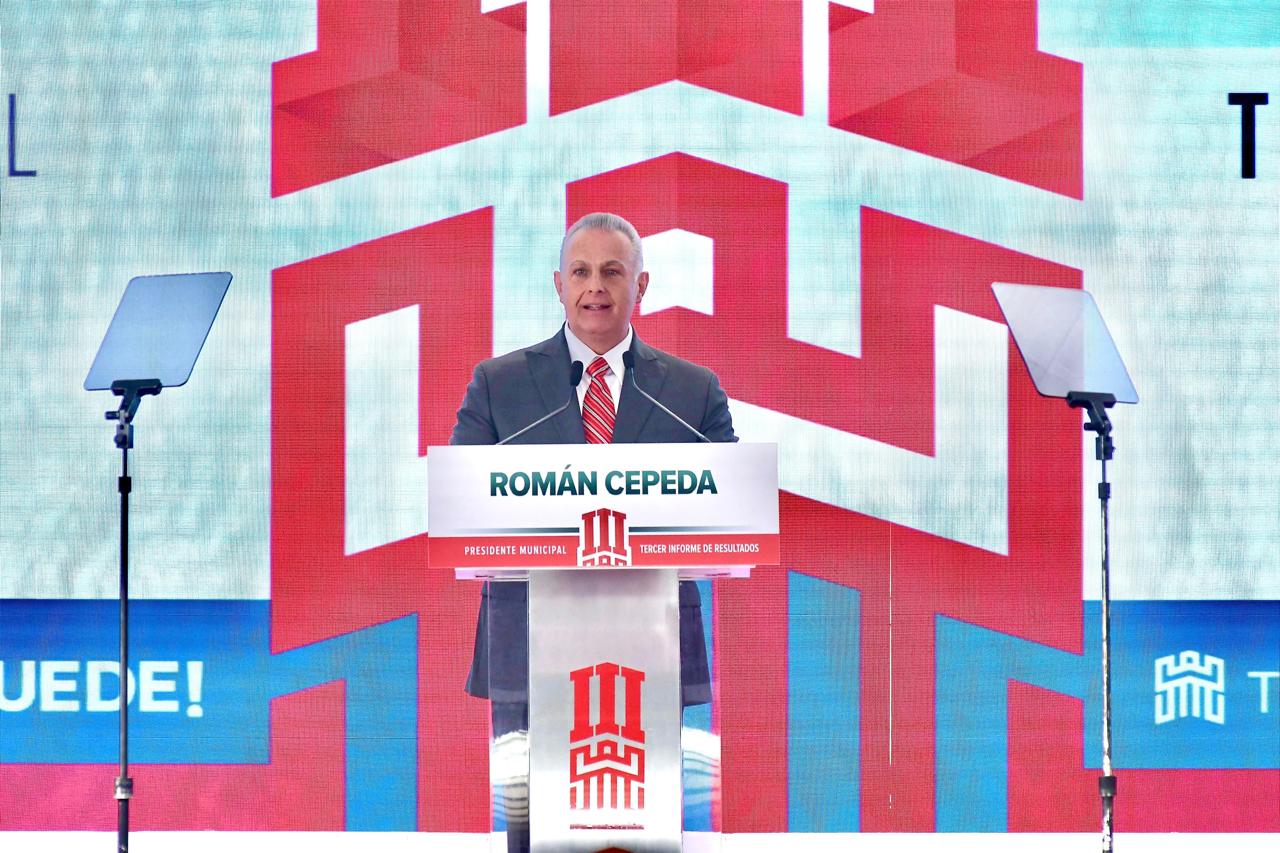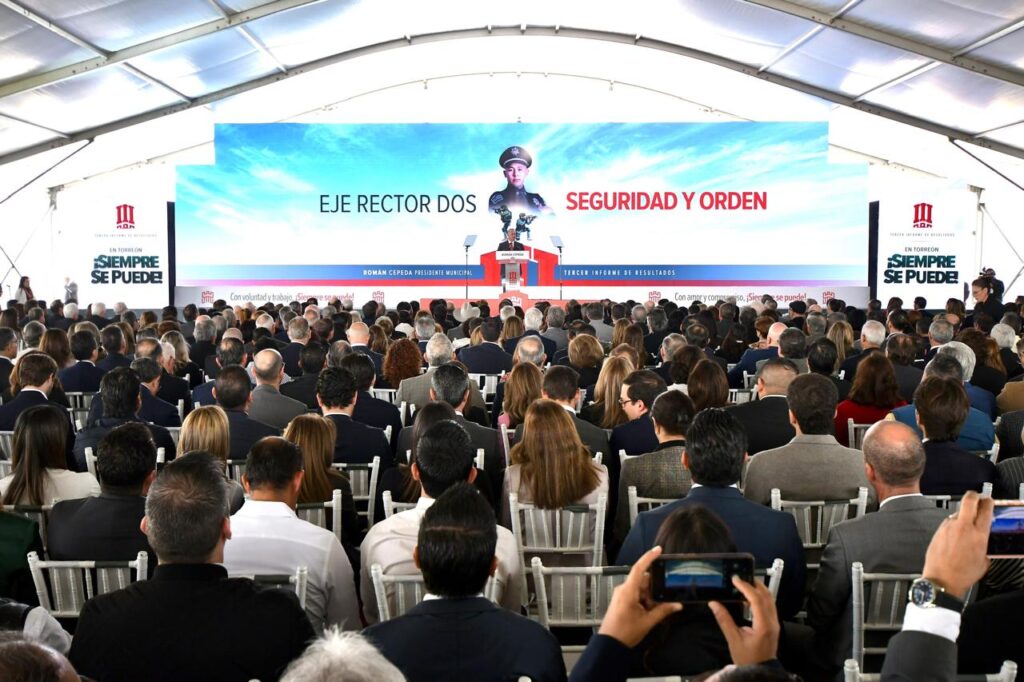 El alcalde Román Alberto Cepeda González rindió esta tarde su tercer informe de resultados al frente de la Administración Municipal de Torreón, en el que destacó los logros alcanzados en materia de seguridad, movilidad, conectividad, obra pública, programas sociales y atracción de inversiones durante el periodo 2022-2023-2024.