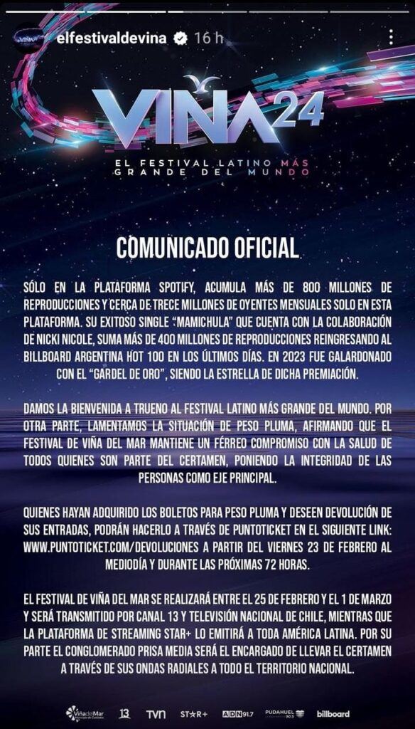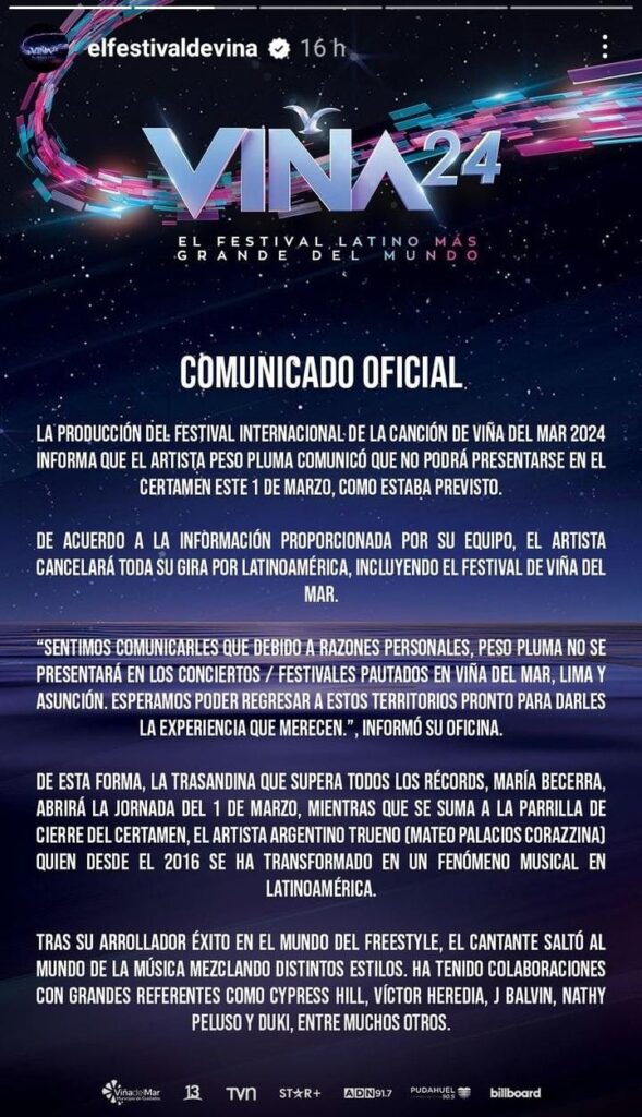“La producción del Festival Internacional de la Canción de Viña del Mar 2024 informa que el artista Peso Pluma comunicó que no podrá presentarse en el certamen este 1 de marzo, como estaba previsto. De acuerdo a la información proporcionada por su equipo, el artista cancelará toda su gira por Latinoamérica, incluyendo el Festival de Viña del Mar”, señala la nota.