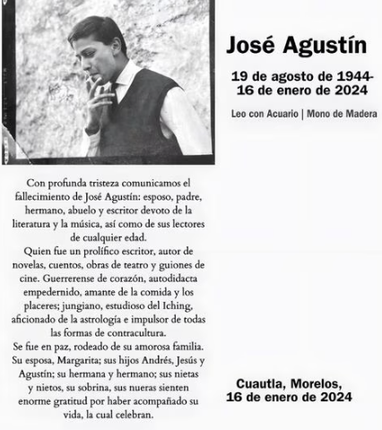 Andrés Ramírez, hijo y editor del escritor, confirmó la lamentable noticia mediante un comunicado oficial. En él expresó: «Con profunda tristeza comunicamos el fallecimiento de José Agustín, quien era esposo, padre, hermano y abuelo, además de ser un devoto escritor apasionado por la literatura y la música, y siempre comprometido con sus lectores de todas las edades. Se despidió en paz, rodeado del cálido amor de su familia.»