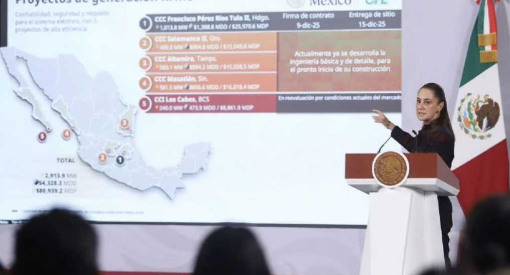 Sheinbaum detalló que la CFE invertirá en cuatro plantas de ciclo combinado que operarán con gas natural, ubicadas en Tula, Hidalgo; Salamanca, Guanajuato; Altamira, Tamaulipas, y Mazatlán, Sinaloa, con una capacidad conjunta cercana a los mil 500 megavatios. A ello se sumará una central de combustión interna en Los Cabos, Baja California Sur.