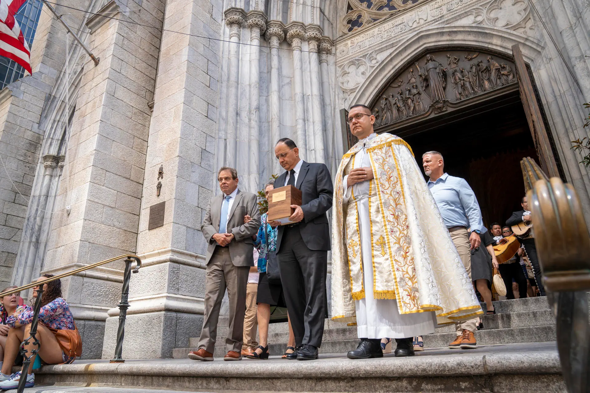 En una íntima ceremonia cargada de simbolismo, el sacerdote Alejandro Sánchez, junto con el cónsul Jorge Islas y familiares de Krause, ingresaron a la imponente iglesia de San Patricio con las cenizas de la difunta. La ceremonia estuvo acompañada de una emotiva ópera en directo y se llevó a cabo en el espacio acotado de la vasta catedral, mientras los turistas observaban con curiosidad.