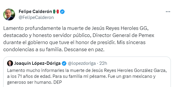 «Lamento profundamente la muerte de Jesús Reyes Heroles GG, destacado y honesto servidor público, Director General de Pemex durante el gobierno que tuve el honor de presidir. Mis sinceras condolencias a su familia. Descanse en paz», escribió en su cuenta de X.